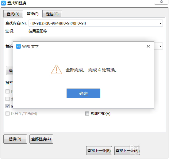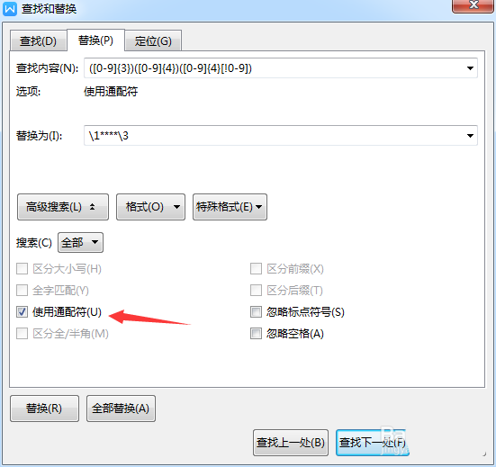 4、把下面的使用通配符勾选上,然后点击全部替换