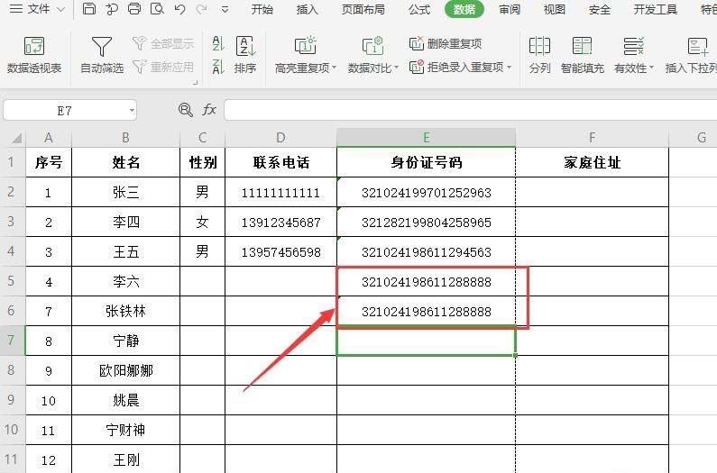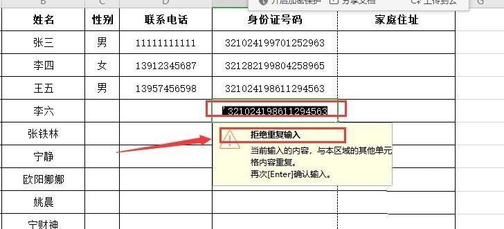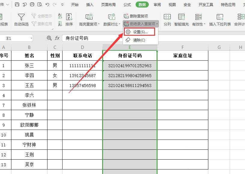 2、表格中,身份证号码具有唯一性,所以选中此列,点击菜单栏“数据”,点击“拒绝录入重复项”(如下图)