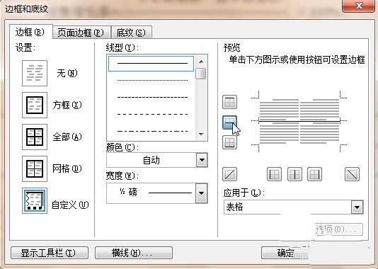 在弹出的“边框和底纹”窗口中的“边框”选项设置中,点击“无”的图标→在预览区域的左侧点击应用于单元格之间的横线→点击“确定”。