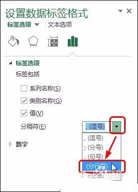 4、打开【设置数据标签格式】窗格,在【标签选项】选项卡下勾选【值】复选框,如下图所示。继续在该选项卡下单击【分隔符】右侧的下三角按钮,在展开的列表中单击【(分行符)】,如下图所示。