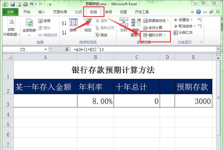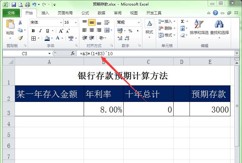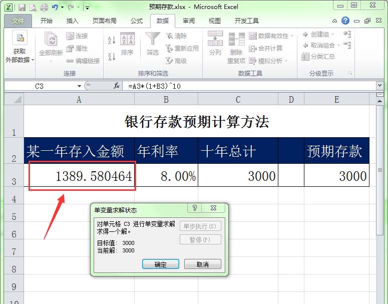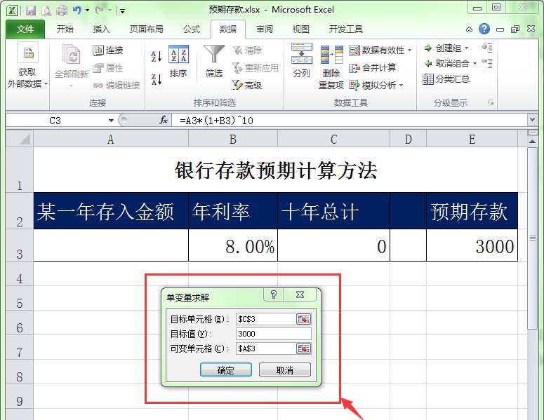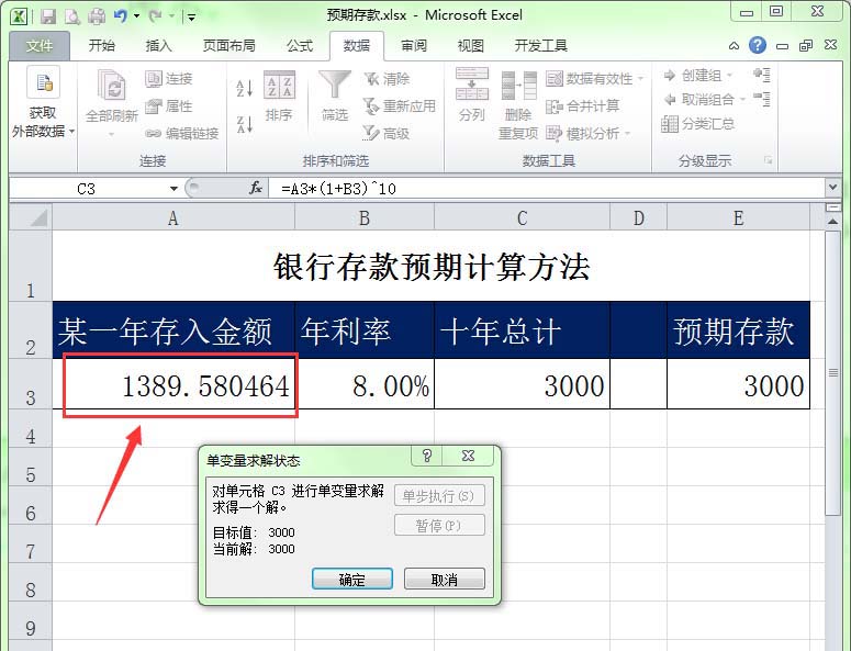 excel做计算题很方便,今天我们就来看看如果用户希望在银行中存入一笔钱来达到一个预期的存款数量。如一年存入一定数量的钱,希望通过得滚得的方式,十年后达到3000元,那么一年应该存入多少钱合适这个问题通过excel公式来解决的办法,请看下文详细介绍。