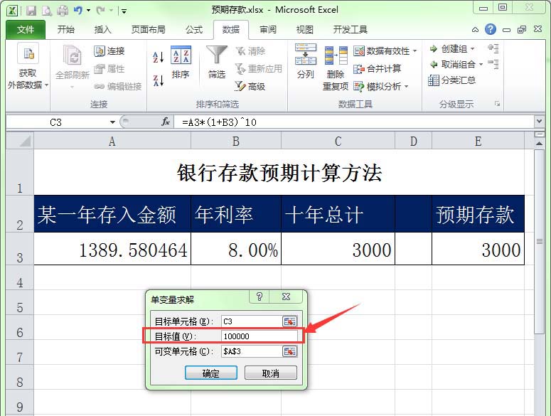 6、当然,如果用户要十年后数量变成”100000“,想求一年存入多少金额,可在”单变量求解“对话框中将”目标值“更改为”100000“即可。