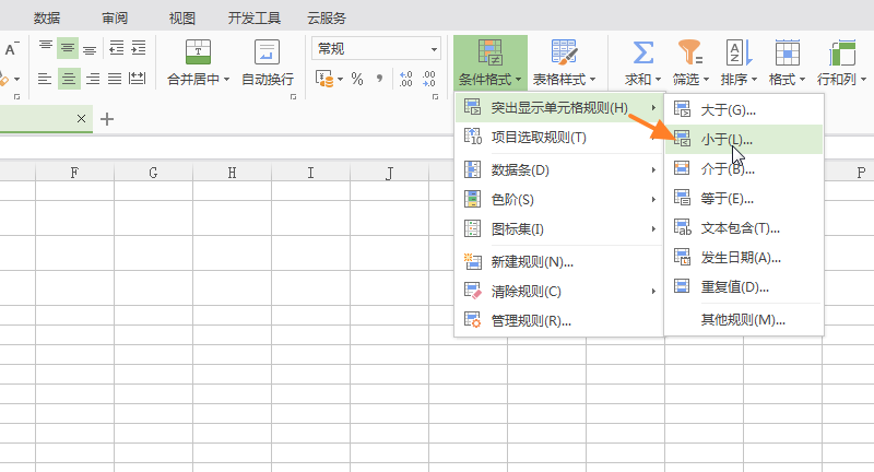 4、点击下拉菜单中【突出显示单元格规则】子菜单中的【小于】选项。