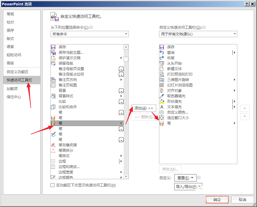 2、在自定义快速访问工具栏中,找到笔命令,将其添加到快速访问工具栏中。