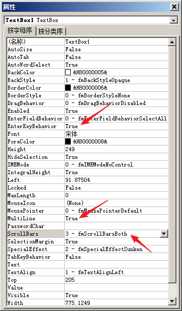 7、在打开的窗口中,按下图中对其中几个项目进行设置。这几个项目分别表示可以换行、多行和使用水平和垂直方向的滚动条。