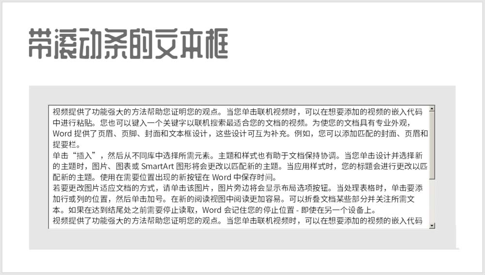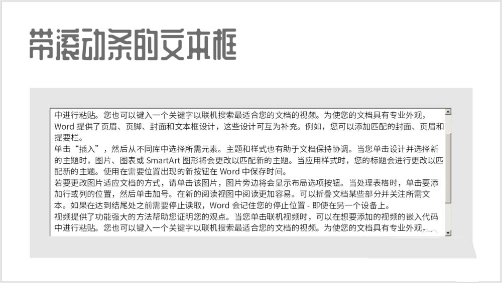 10、执行放映,即可看到,在文本框右侧有了滚动条,可以通过滚动条显示出更多的内容。