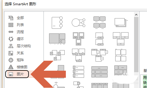 1、首先打开PowerPoint软件,然后依次点击“插入”-“SmartArt”,在弹出的选择SmartArt对话框点击左下角的“图片”,见图二...