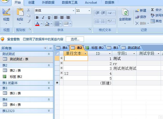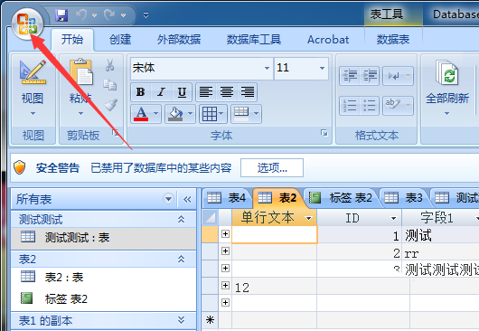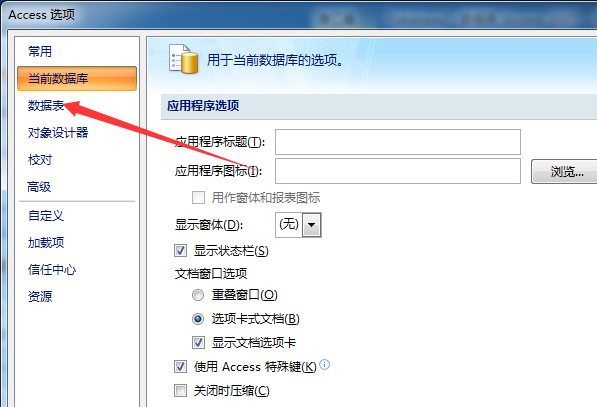 4、点击了access选项之后,点击左侧中的数据表的选项