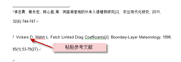 3、点击插入尾注,在文章末尾会出现数字编号,在编号后面粘贴尾注(一般为参考文献)