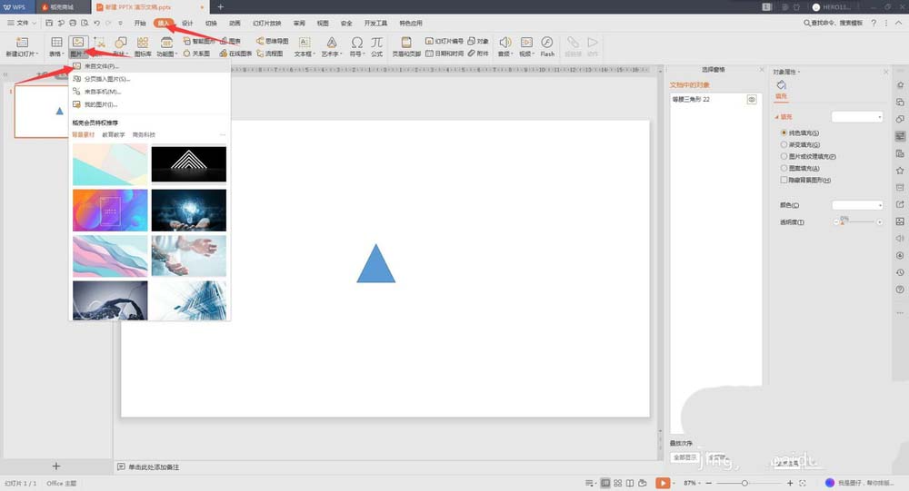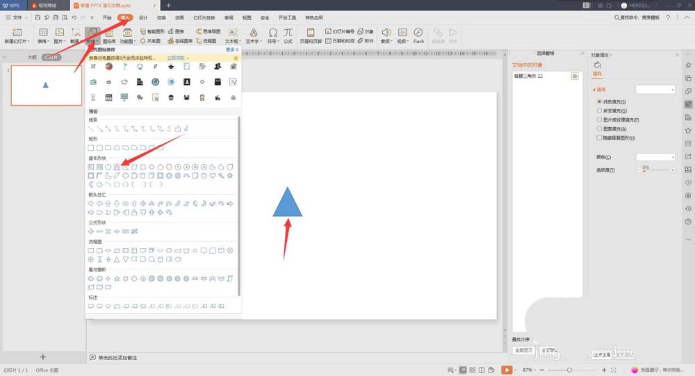 1、新建一个空白PPT,插入,形状,这里我们先绘制一个正三角形,以确定三个扇叶的位置角度