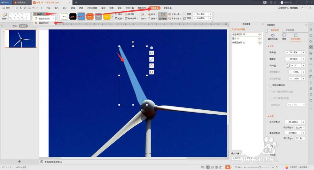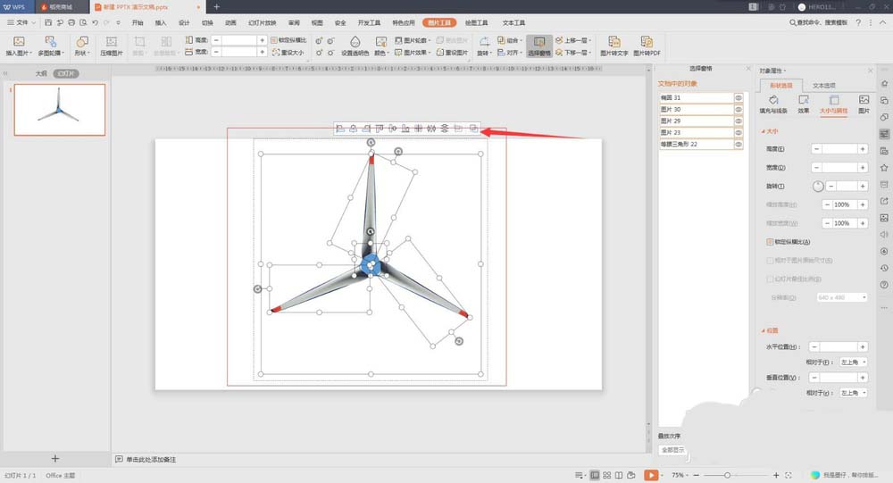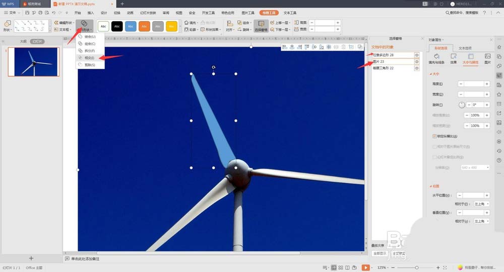 5、画好曲线后,按着Ctrl依次点击图片和曲线形状,然后选择合并形状,相交,此时抠出了一个扇叶