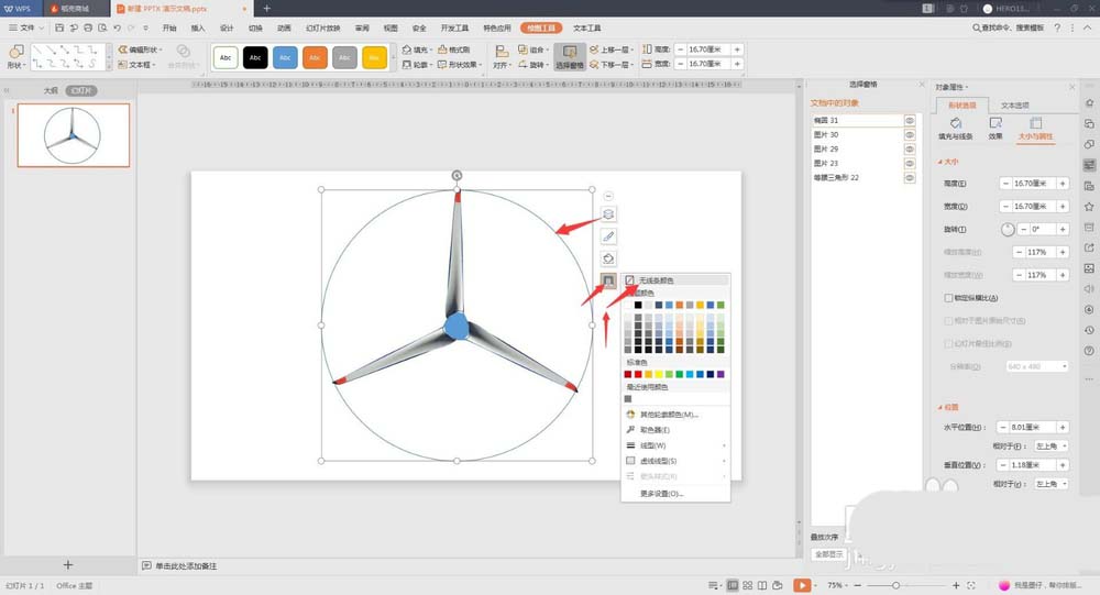 7、然后我们利用形状画一个圆,来控制动画的旋转中心,让这个圆的圆心与风电的中心重合,并且能够完全罩住扇叶。我们再把这个圆的填充和线条改为无,让其不被看见