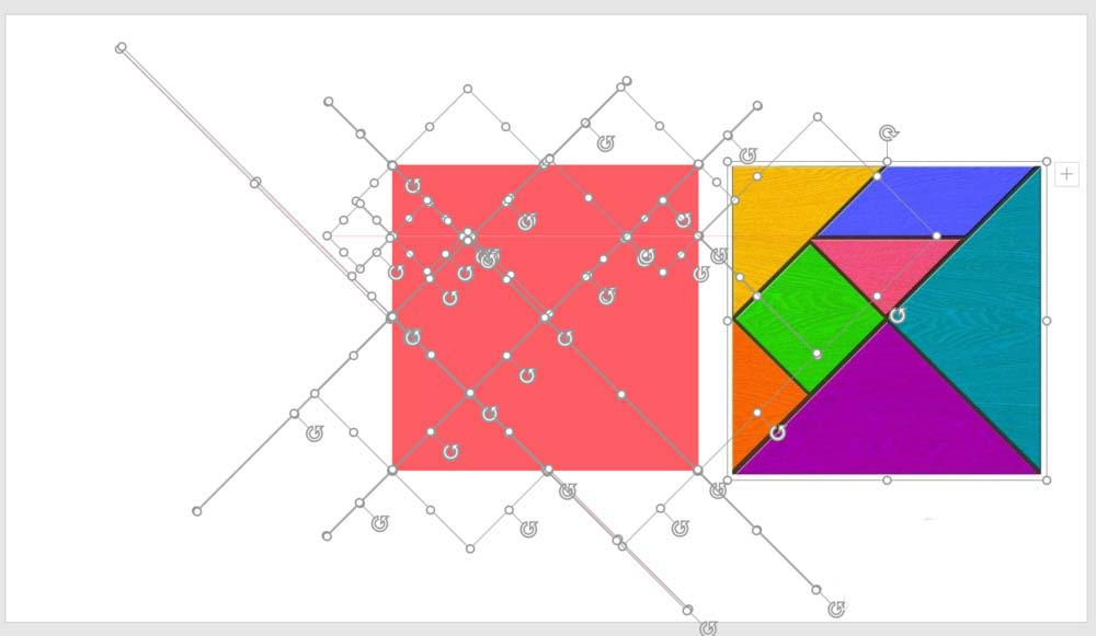 5、复制细像线一样的矩形,旋转后放在七巧板图片中形状与形状的空隙处,注意对照图片对细矩形调整旋转角度。