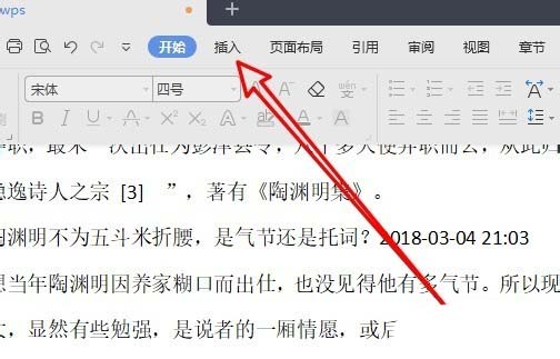 1、首先在电脑上用wps2019打开要编辑的文档,然后点击菜单栏上的“插入”菜单项。