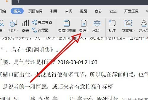 2、接着在打开的插入工具栏上点击“页码”的下拉按钮。