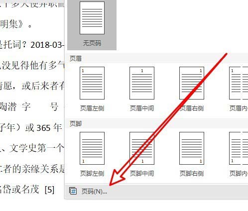 3、然后页面菜单中我们点击“页码”的菜单项。