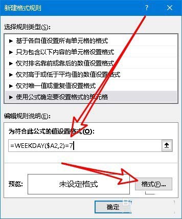 5、然后我们在下面的设置公式文本框中输入=WEEKDAY($A2,2)=7,然后点击右下角的“格式”按钮。