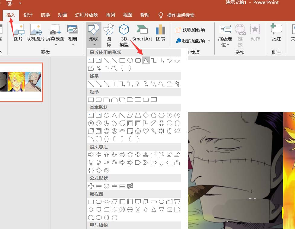 3、接着我们点击上方的插入选择形状,插入一个三角形。