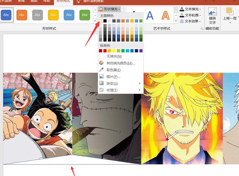 5、然后我们选中,我们调整好的三角形将其形状填充设置为白色,框线颜色设置为无色。
