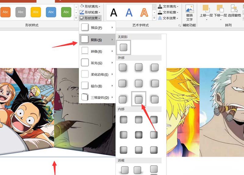 6、然后我们继续选中等腰三角形设置阴影效果,为向上阴影,如下图所示。