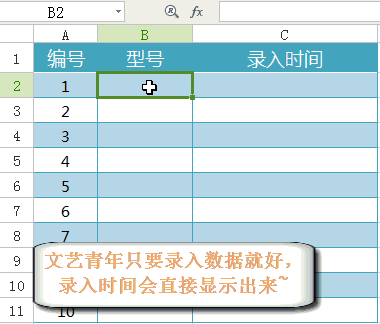4、输入数据,自动出现录入时间