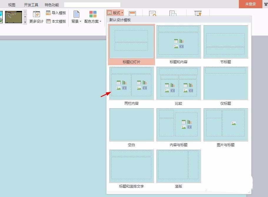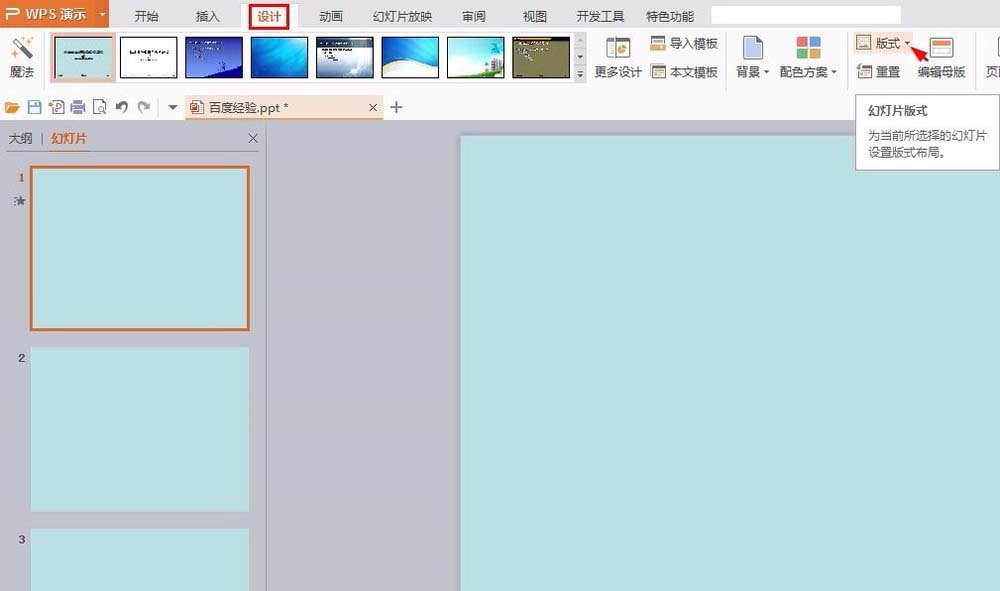2、在菜单栏“设计”中,单击“版式”后面的小黑三角。