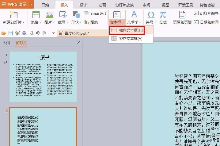 3、再次在菜单栏“插入”中选择“横向文本框”。