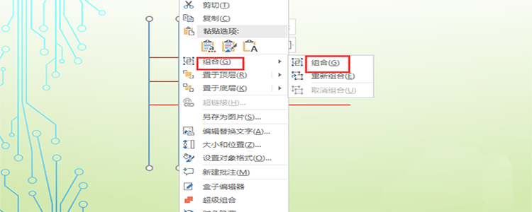 4、组合5条竖线。选中这5条竖线,然后右键单击,在弹出的菜单中选择“组合”,点击它,即可将这5条竖线组合成一个整体了。