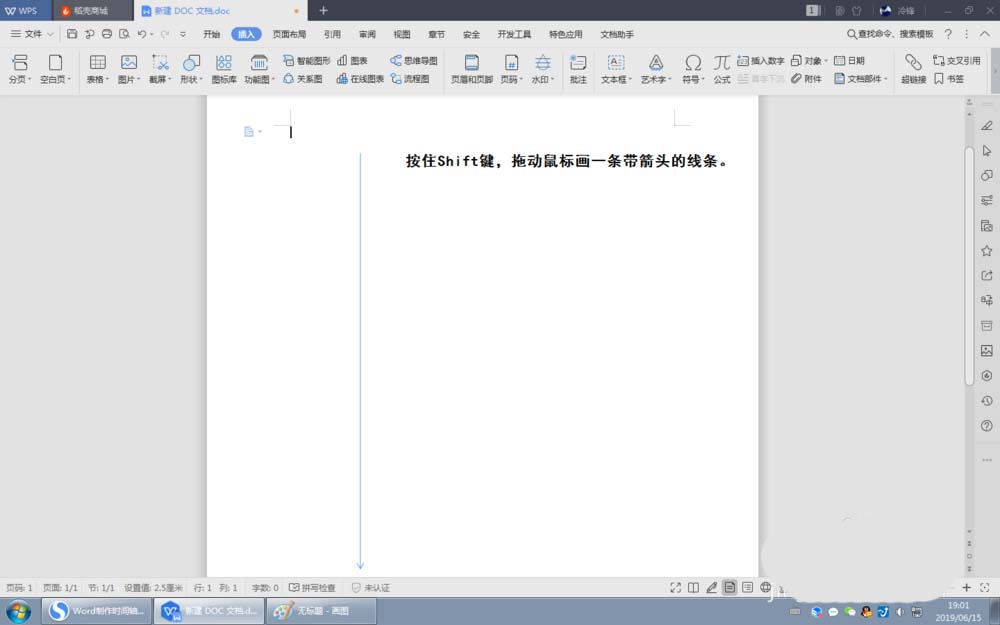 1、我们先插入一个带箭头的线条,在文档顶部留些空白处写标题,然后向下拉到底部。再调整下线条颜色,再把线条设为虚线。(可以根据自己喜欢的样式去设置一下)