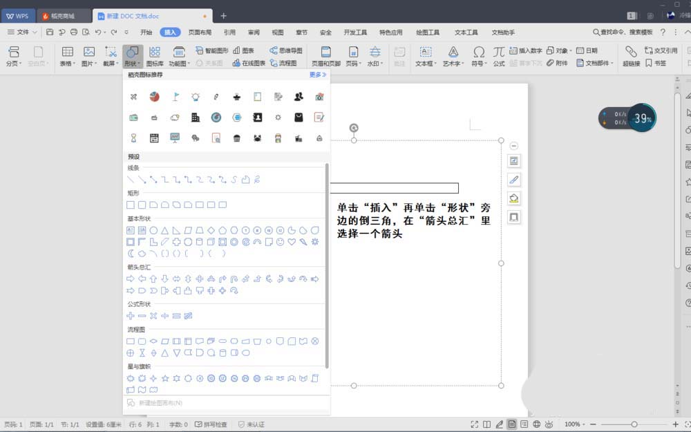 4、单击“插入”再“形状”中的"箭头总汇",表格中的第二个单元格中画一个的五边形。通过挪动第二个单元格左侧竖线位置,调整五边形位置。