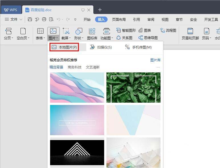 打开一个需要将图片居中显示的wps文档,单击菜单栏“插入”中的“图片--本地图片”。