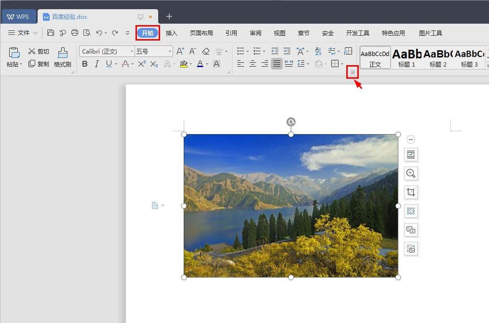1、选中要居中显示的图片,单击菜单栏“开始”中红色方框标记的按钮。