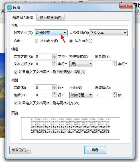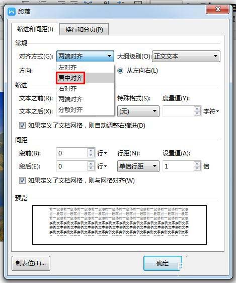 2、在弹出的“段落”对话框中,单击红色箭头标记的位置,选中“居中对齐”。