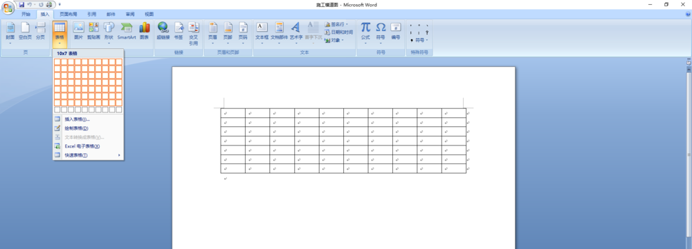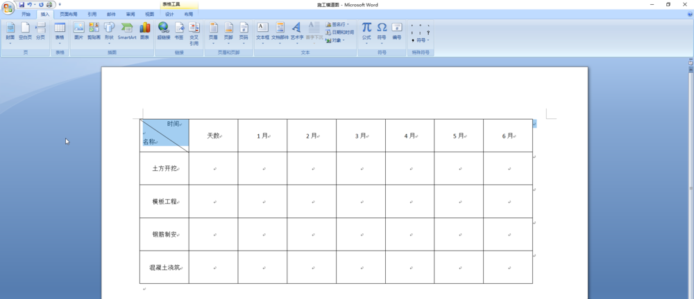 2、先创建好一个Word文档,起名为某某工程施工横道图。打开Word后,选择插入——表格,具体可以根据你的工程项目的分部工程的数量以及工期来设定。这个可以在绘制过程中不断的进行修改。