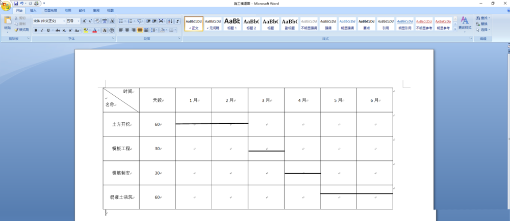4、根据施工进度计划,严格按照工程的先后顺序绘制横道图,每一项工程所需多长时间就按表格时间绘制多长的直线。