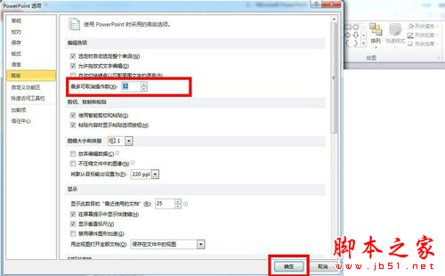 在“powerpoint选项"窗口上点击菜单“高级”,就可以看到“最多可取消操作”的选项,只要把那里的数字改成你想要的数字,点击“确定”就可以增加撤销次数了。