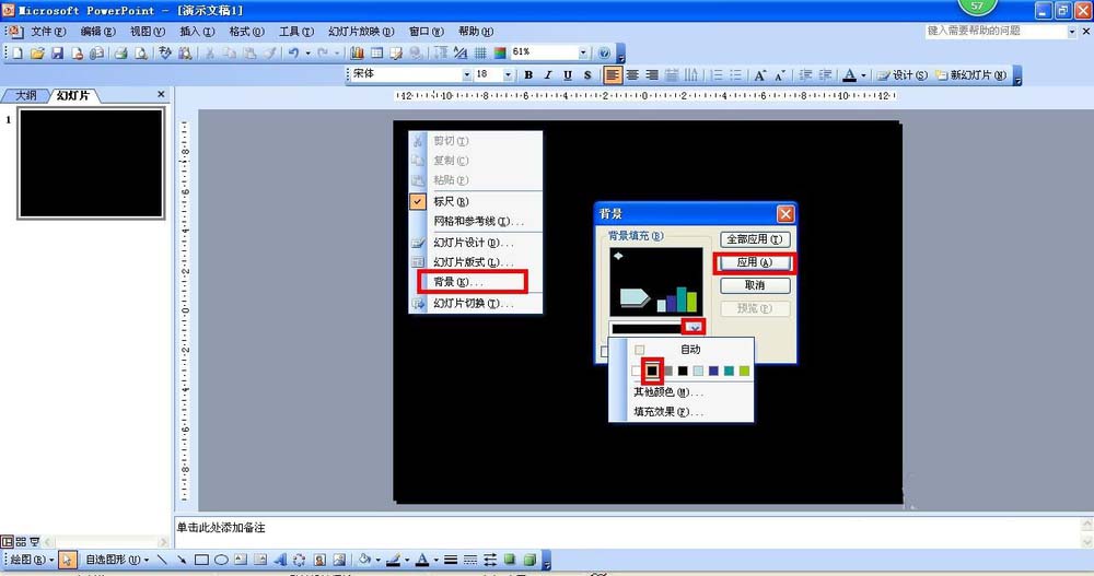 1、打开PPT2003,,新建一个空白文档,右击编辑页面——背景——在颜色选择那里点击下拉箭头,选择黑色——点击应用——关闭退出背景设置选项。
