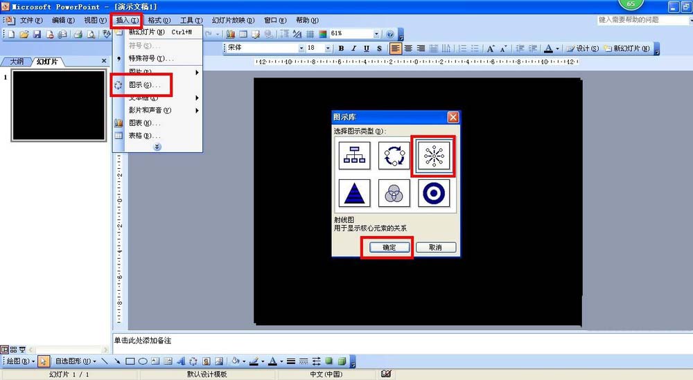 2、点击插入——图示——在图示库中的图示类型选择射线图——点击确定插入射线图到编辑页面那里。