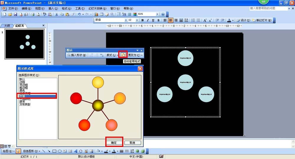 3、点击射线图,让射线图处于激活状态,这时就会出现图示工具条——点击图示工具条的自动套用格式——在弹出的图示样式库中选择热情——点击确定,就可以设置光芒四射的射线图。