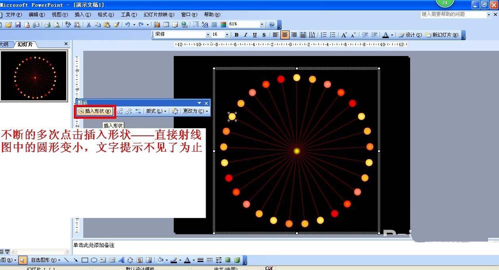 4、不断的多次点击图示工具条上的:插入形状——直接射线图中的圆形变小,文字提示不见了为止,也可以多添加形状,直到自己满意为止。这样光线炫光就出来了。