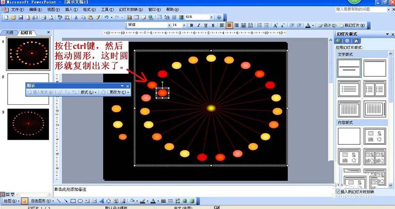 5、因为这热情格式的颜色很好看,现在要把射线图的圆形提取出来:按住ctrl键,然后拖动圆形,这时圆形就复制出来了。