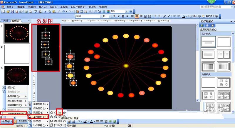 6、把复制出来的圆形转换成星形,这样就可自动变成发出炫光的星星了。按住ctrl键点击选择所有复制出来的星形——点击绘图——改变自选图形——星与旗帜——选择星形,这样就一下变成充满炫光的星星了。