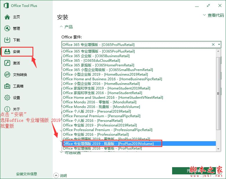 1、安装---Office套件里选择:Office 专业增强版 2019 - 批量版 - [ProPlus2019Volume]