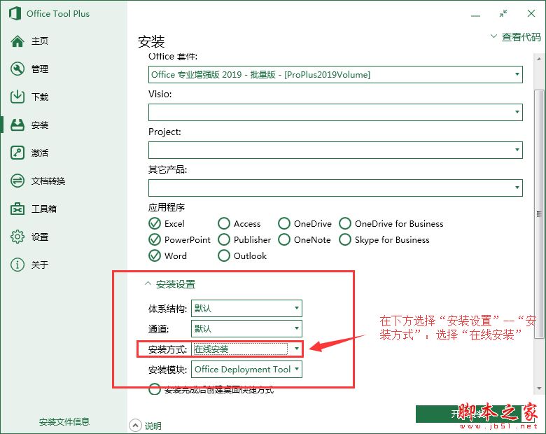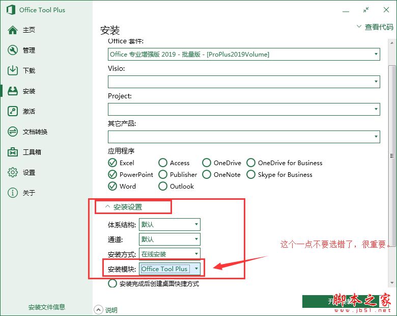 3、安装---安装设置---安装模块:Office Tool Plus(重要)红起来要考