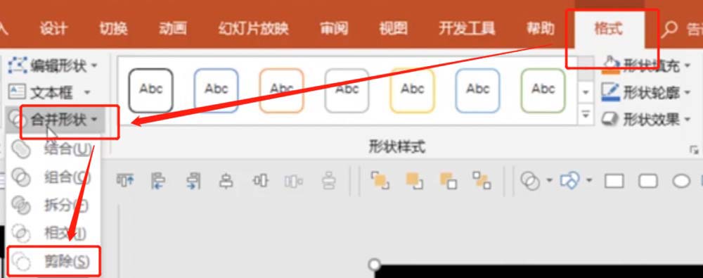 3、在上方找到“格式”中的“合并形状”,选择“剪除”