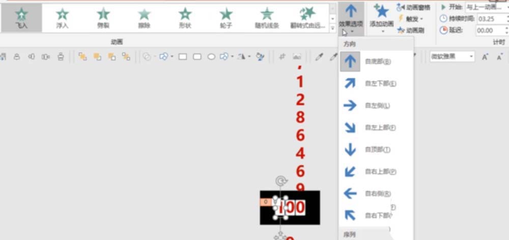 9、设置最左边的数字的“效果选项”为“自底部”,持续时间为3.25秒