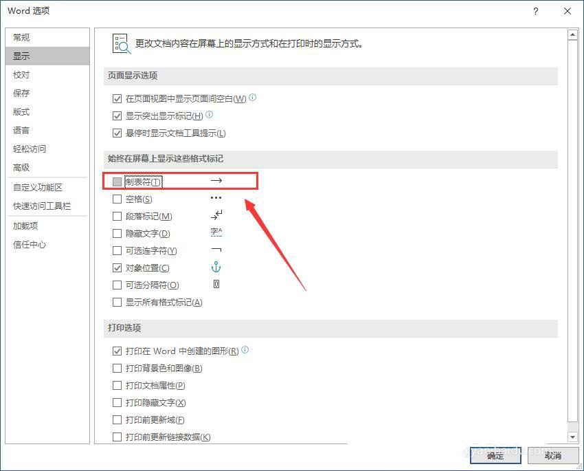 4、看到右边的“制表符”前面的框了吗,因为这个框打了勾,所以就会显示制表位的标记,现在我们把这个勾去掉,点击确定