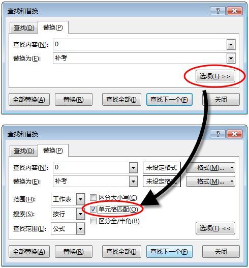 这边是精确替换,记得在查找内容的对话框中,勾选单元格匹配一项即可,如果勾选区分大小写,全/半角,则会根据具体的数据格式进行操作。