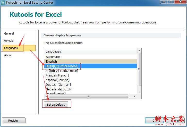 7、点击左例表Languages,选择简体中文,点击Set as Default,语言便成设置成中文