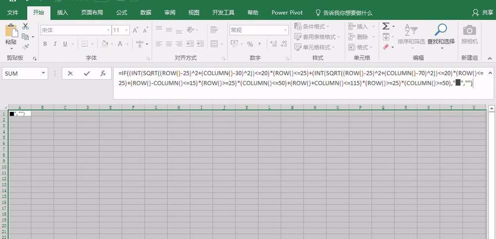3、在编辑栏输入公式=IF((INT(SQRT((ROW()-25)^2+(COLUMN()-30)^2))<=20)*(ROW()<=25)+(INT(SQRT((ROW()-25)^2+(COLUMN()-70)^2))<=20)*(ROW()<=25)+(ROW()-COLUMN()<=15)*(ROW()>=25)*(COLUMN()<=50)+(ROW()+COLUMN()<=115)*(ROW()>=25)*(COLUMN()>=50),"█","")